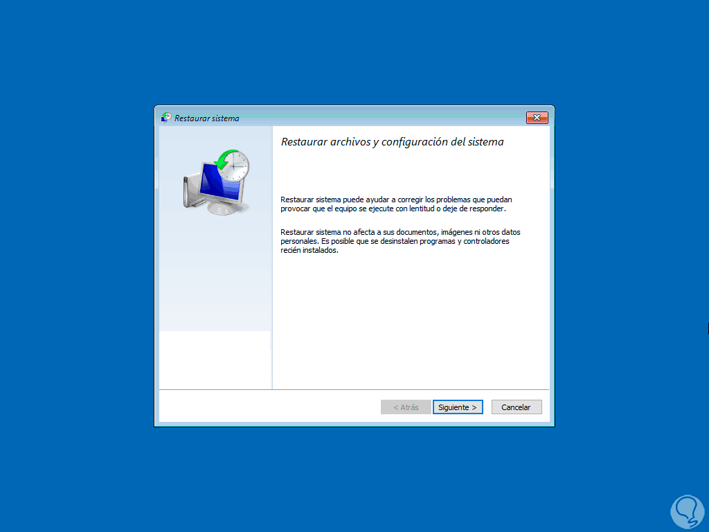 Damos clic en “Continuar” y se abrirá el asistente de Restauración del sistema: