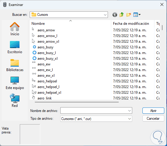 Damos clic en "Examinar" para abrir todas las opciones de cursores: