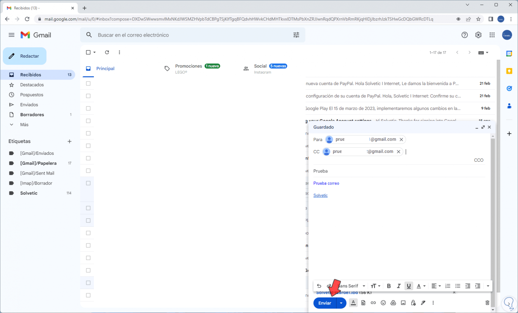 Damos clic en "Enviar" para enviar el correo electrónico: