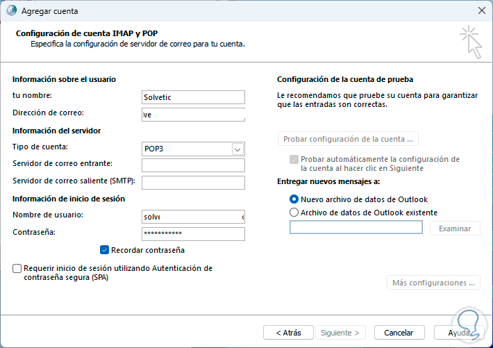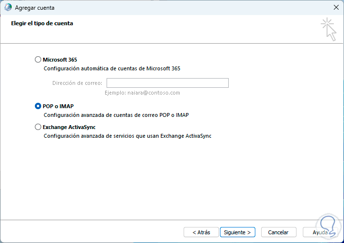 Damos clic en Siguiente y allí activamos la casilla "POP o IMAP":