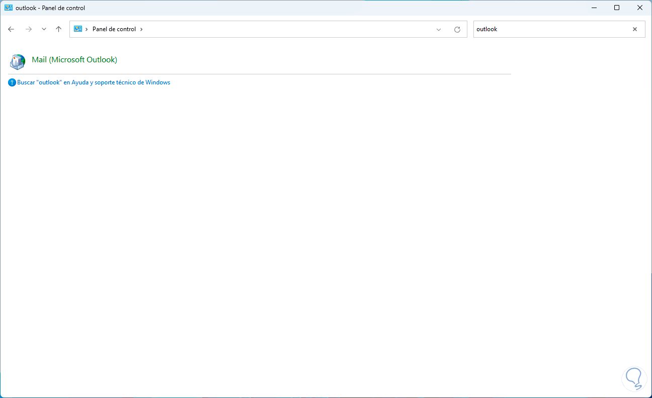 Para crear esto abrimos el Panel de control, en el buscador ingresamos "outlook" y luego damos clic en "Mail (Microsoft Outlook)":