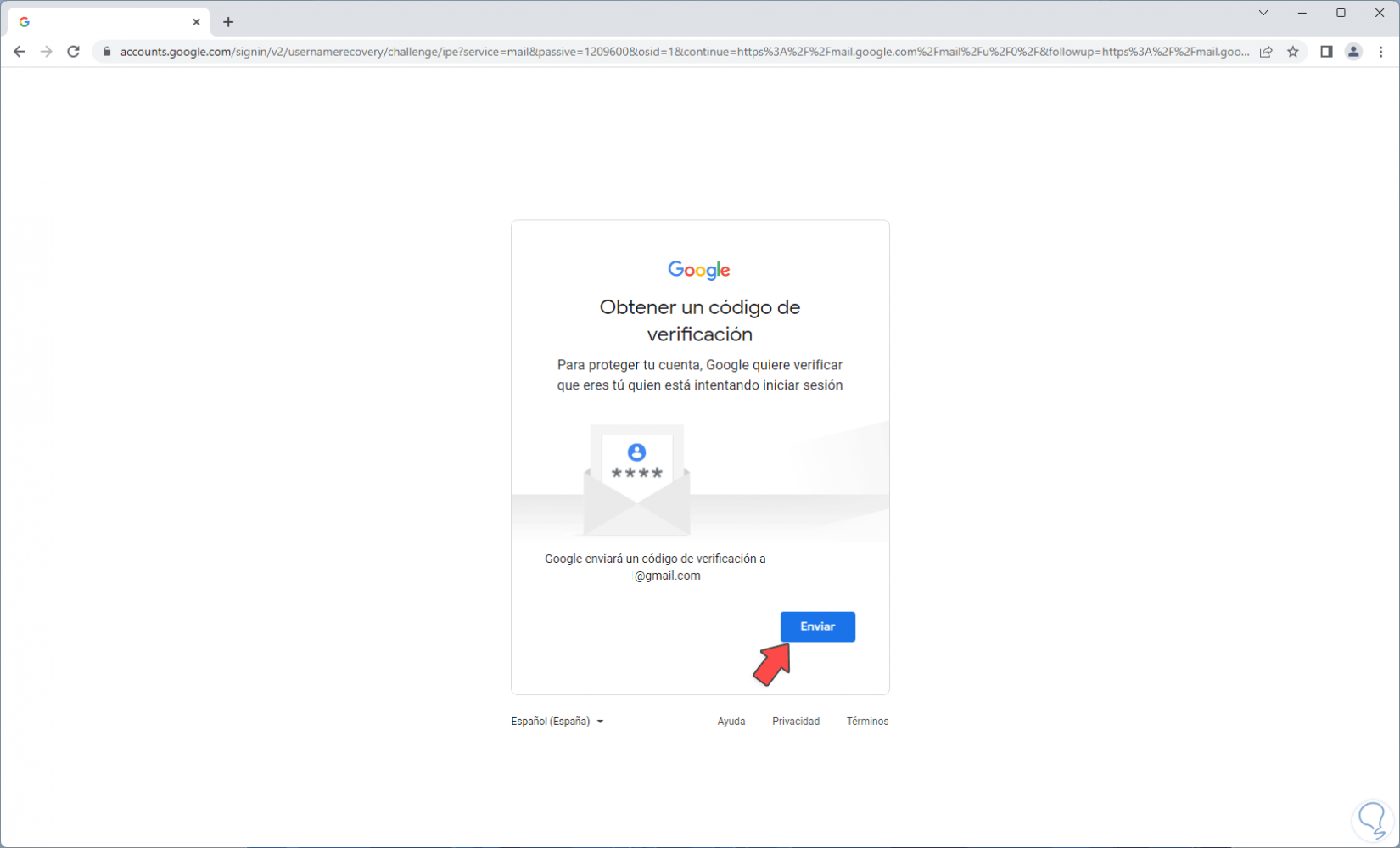 Damos clic en "Enviar" para recibir un código en el correo de recuperación en el mail de recuperación: