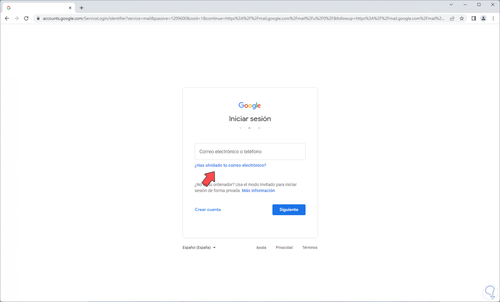 Como mencionamos no es algo común pero puede pasar que en algún momento olvidemos la cuenta de correo, para esto será necesario que la cuenta a buscar se le haya asignado un numero de móvil o bien otra cuenta de correo como respaldo, en la web de Gmail damos clic en "¿Has olvidado tu correo electrónico?":