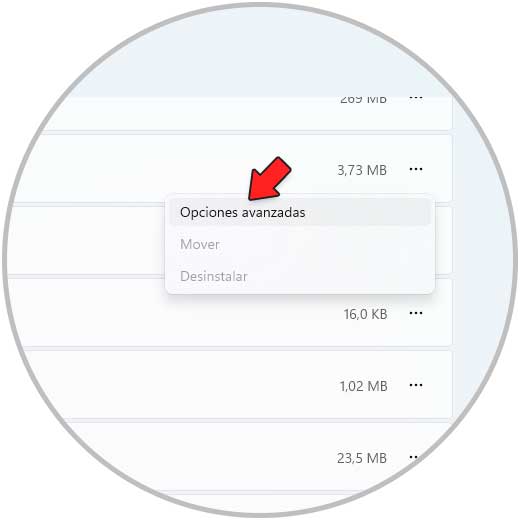 Damos clic en el menú contextual de Microsoft Store, seleccionamos "Opciones avanzadas":