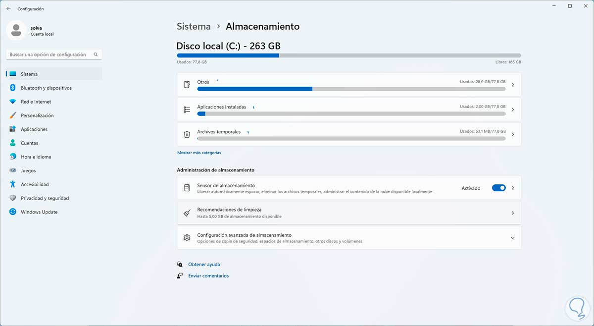 Vamos a "Inicio - Configuración - Sistema - Almacenamiento":