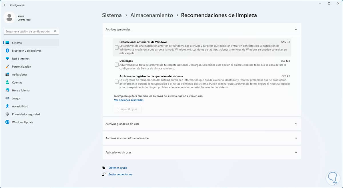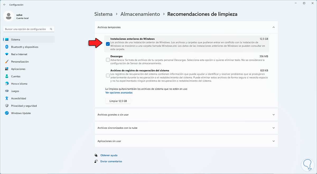 2 Cómo eliminar Windows old desde Almacenamiento (temporales)