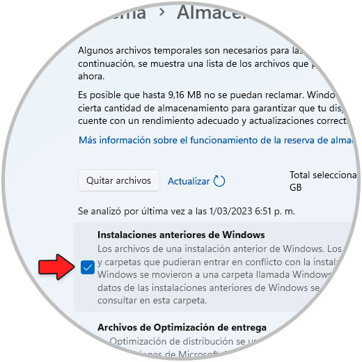 Activamos la casilla "Instalaciones anteriores de Windows" y luego damos clic en el botón "Quitar archivos" para realizar la operación.