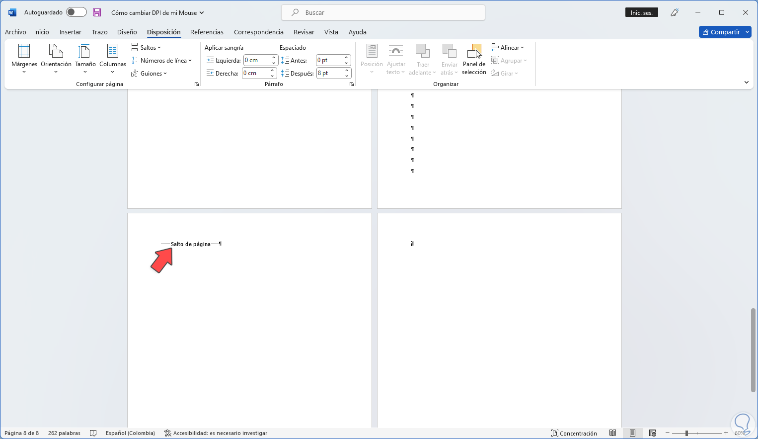 Cuando veamos solo las marcas se hace referencia a que se ha usado la tecla Enter para generar el espacio, cuando es un salto de página veremos la leyenda: