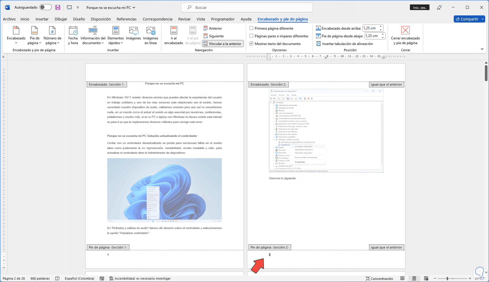 En la segunda página damos clic en "Vincular a la anterior" para remover este atributo: