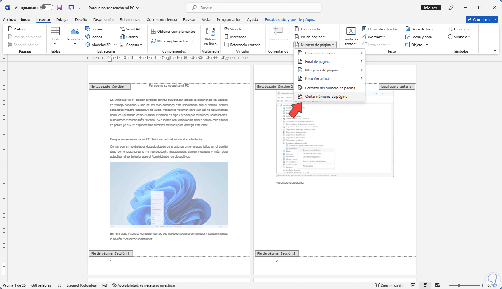 Ubicamos el cursor en la primer página y vamos a "Insertar - Número de página - Quitar números de página":