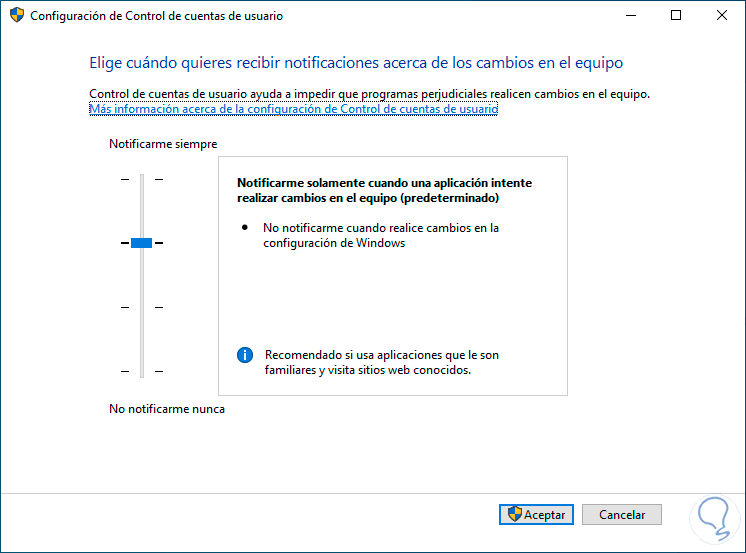 El Control de cuentas en Windows 10 permite definir el nivel de seguridad asignado para realizar diversas tareas en Windows, es probable que el nivel de seguridad este muy alto y se asuma que una app es maliciosa ocasionando su bloqueo.