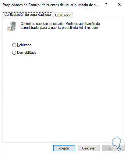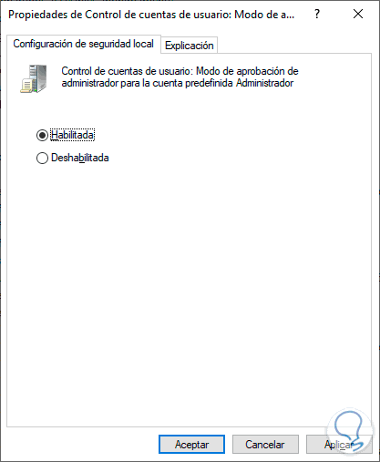 Esta configuración de directiva se encarga de gestionar el comportamiento del Modo de aprobación de administrador para la cuenta predefinida como Administrador.