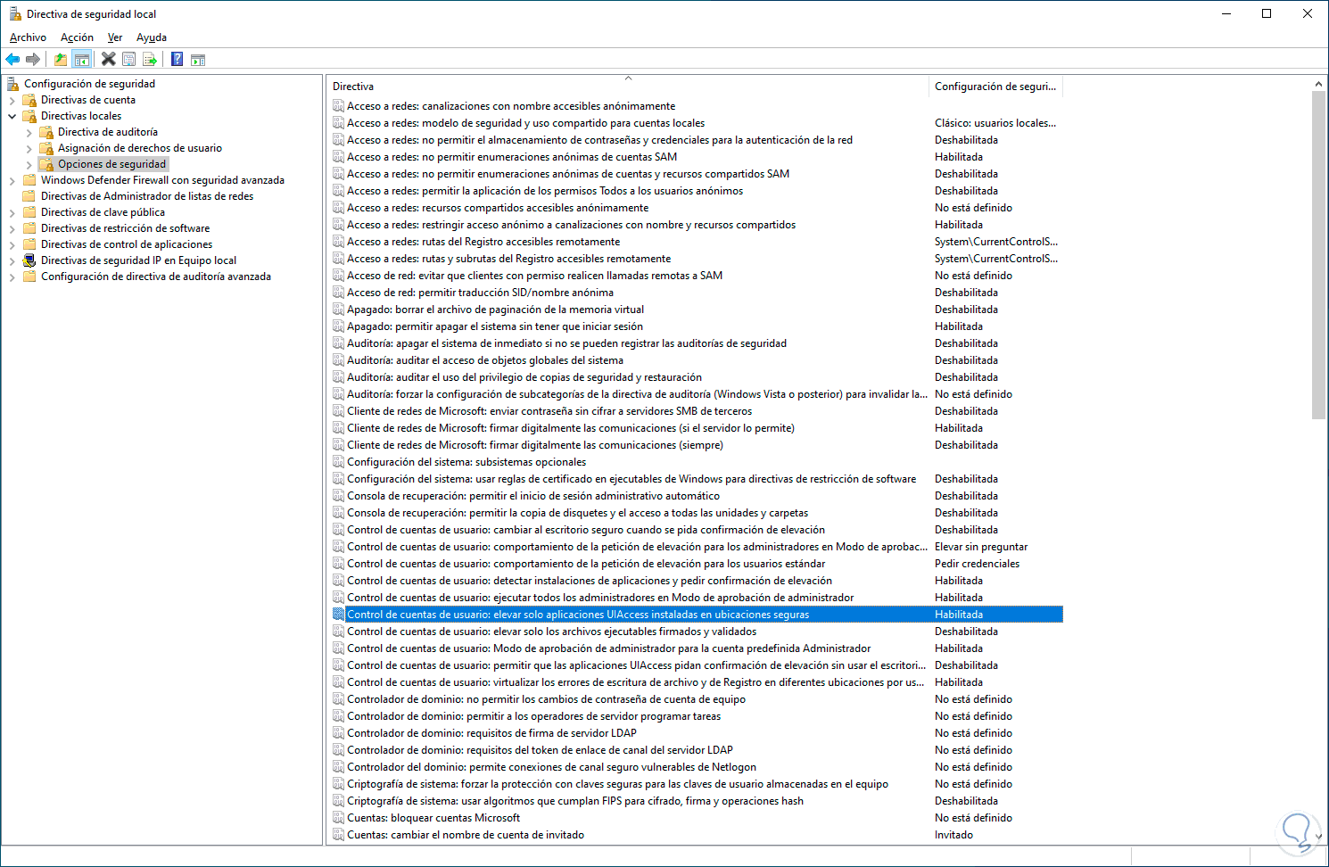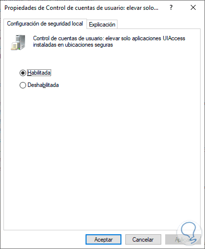 Esta es una directiva que gestiona si las aplicaciones que requieren el permiso de ejecución usando un nivel de integridad de accesibilidad de la interfaz de usuario (UIAccess), están en una ubicación segura en el sistema de archivos, estas ubicaciones seguras son: