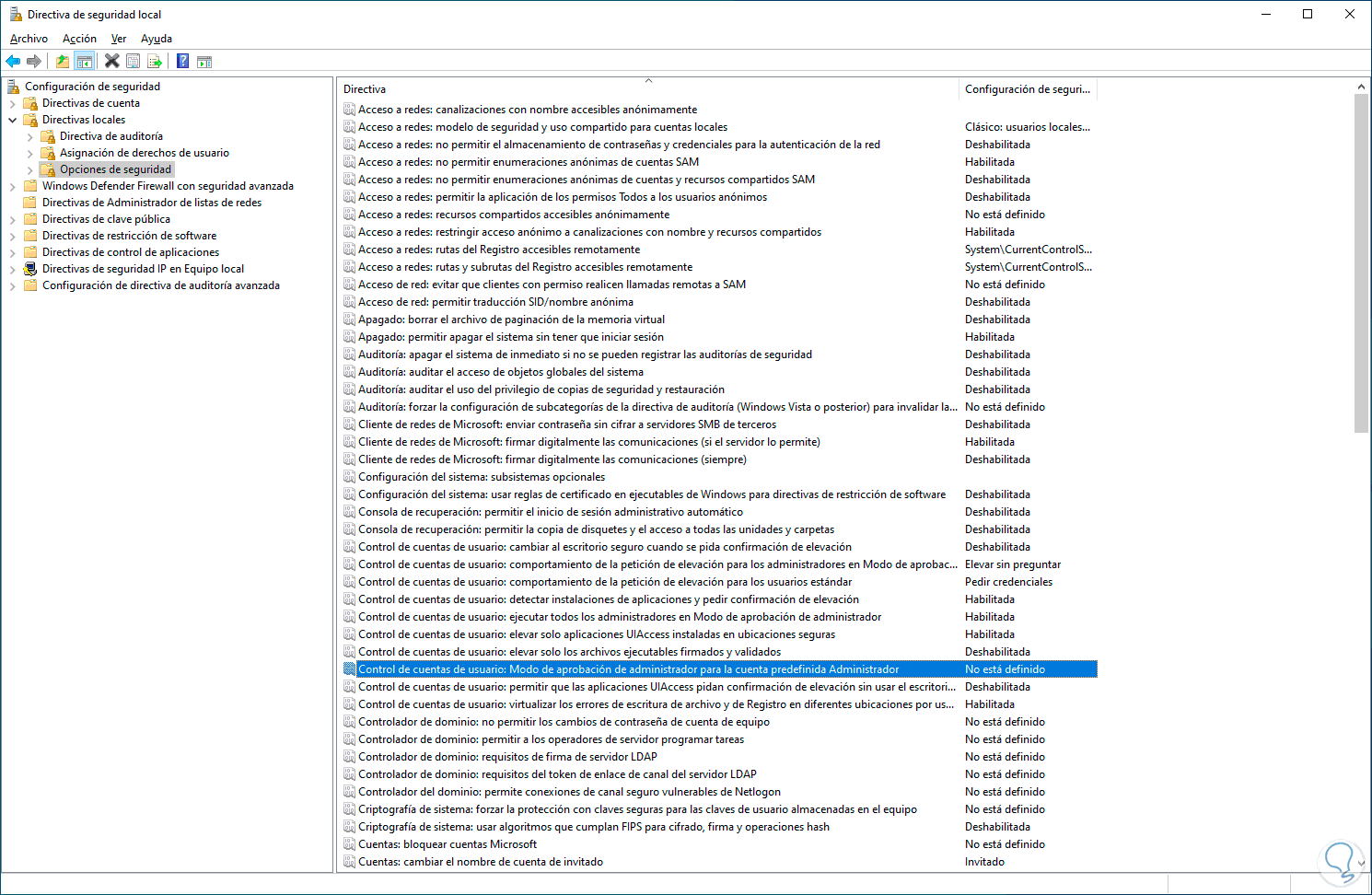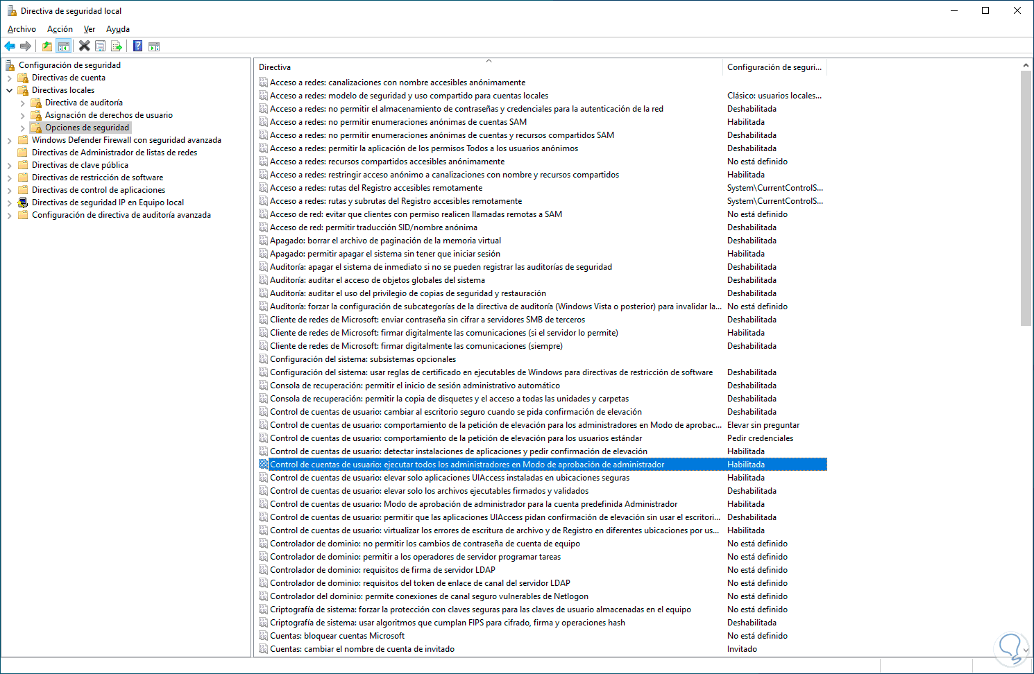 Vamos a "Directivas locales - Opciones de seguridad", damos doble clic sobre la política: