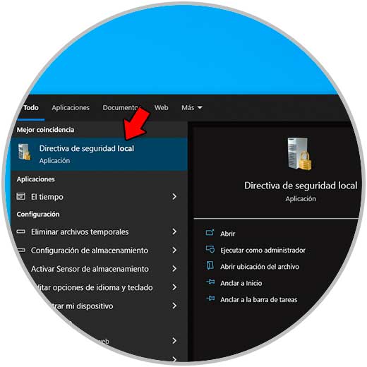 Para su uso en el buscador ingresamos "local" y damos clic en "Directivas de seguridad local":