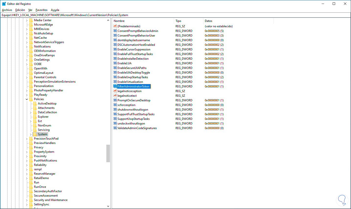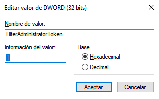 Damos doble clic sobre el valor "FilterAdministratorToken" y confirmamos que el valor sea 1: