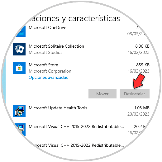 En "Aplicaciones y características" damos clic sobre "Microsoft Store" y seleccionamos "Opciones avanzadas":