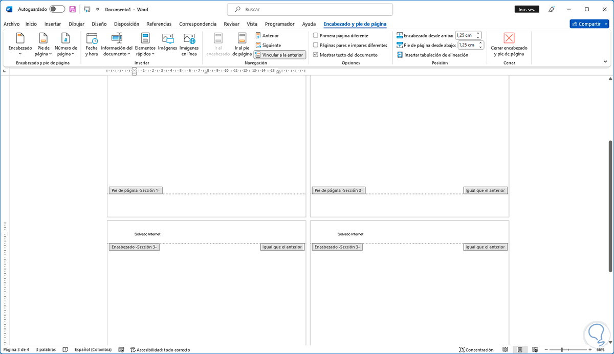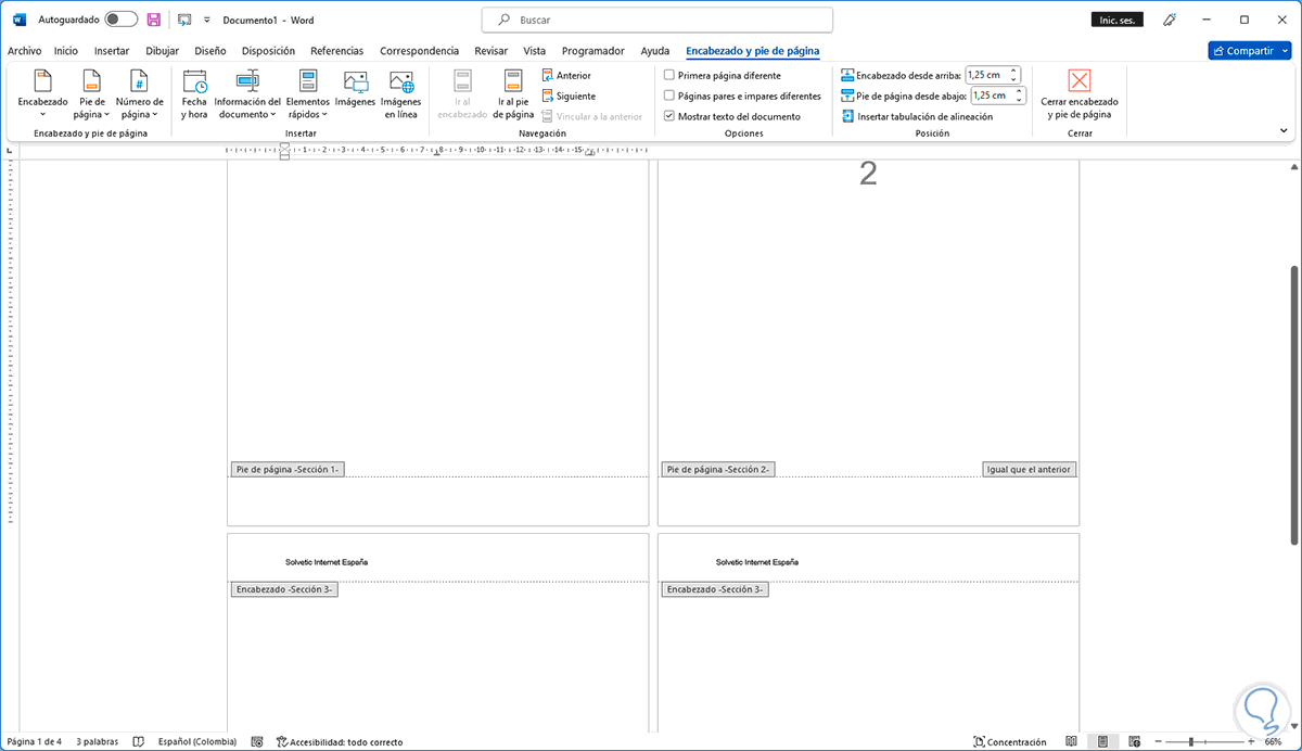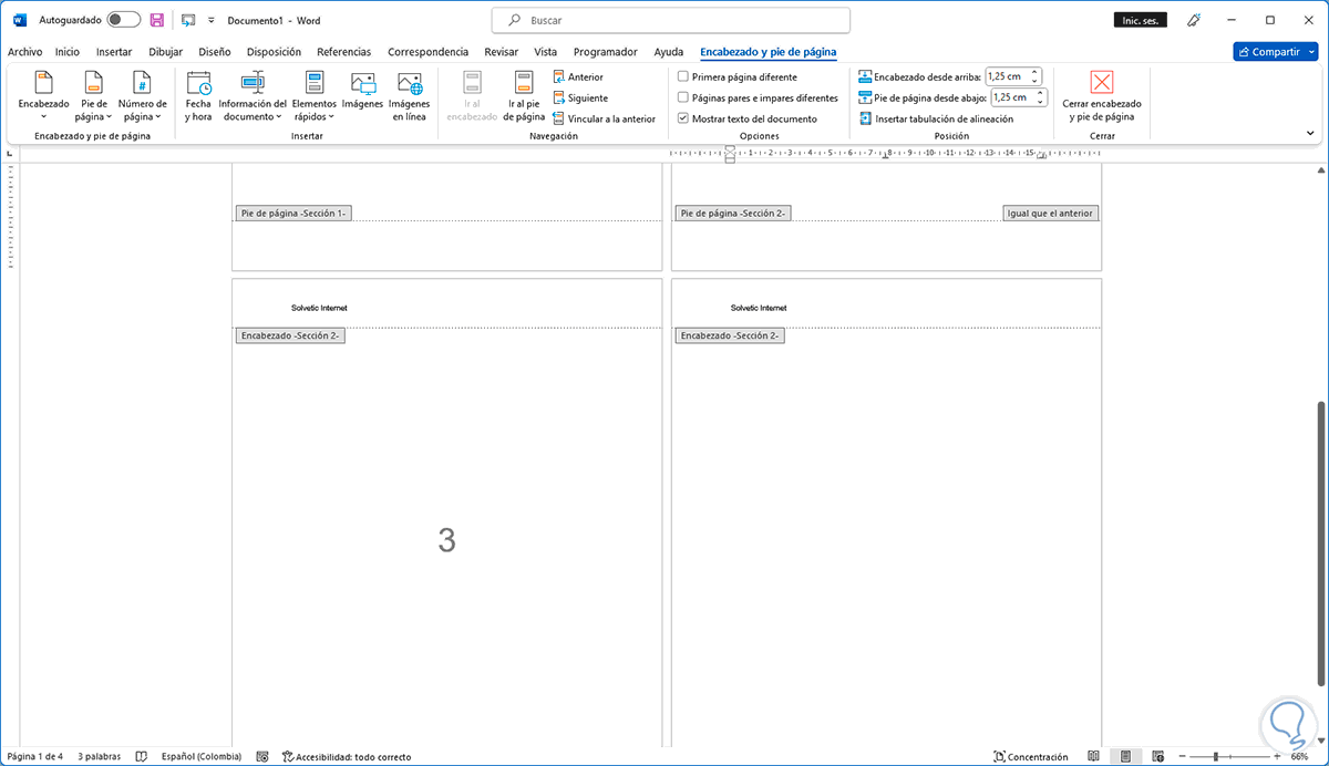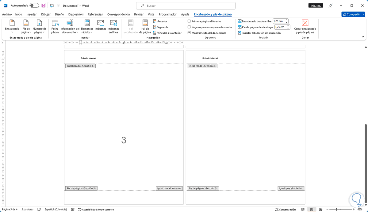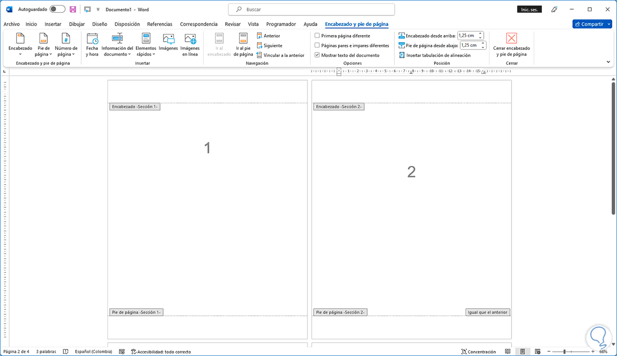 Damos doble clic sobre el encabezado y ahora podemos ver que se añade la leyenda "Sección #":