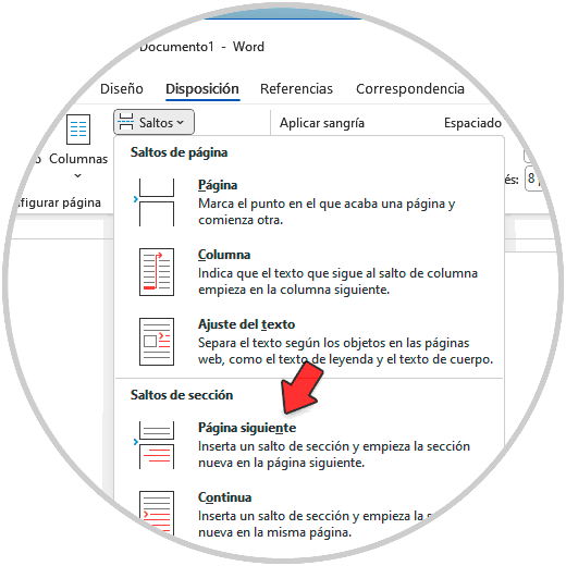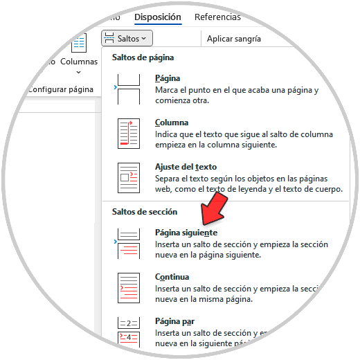 Ubica el cursor en la segunda página, ubicamos el cursor al final de esta y luego ve a "Disposición - Saltos - Página siguiente":