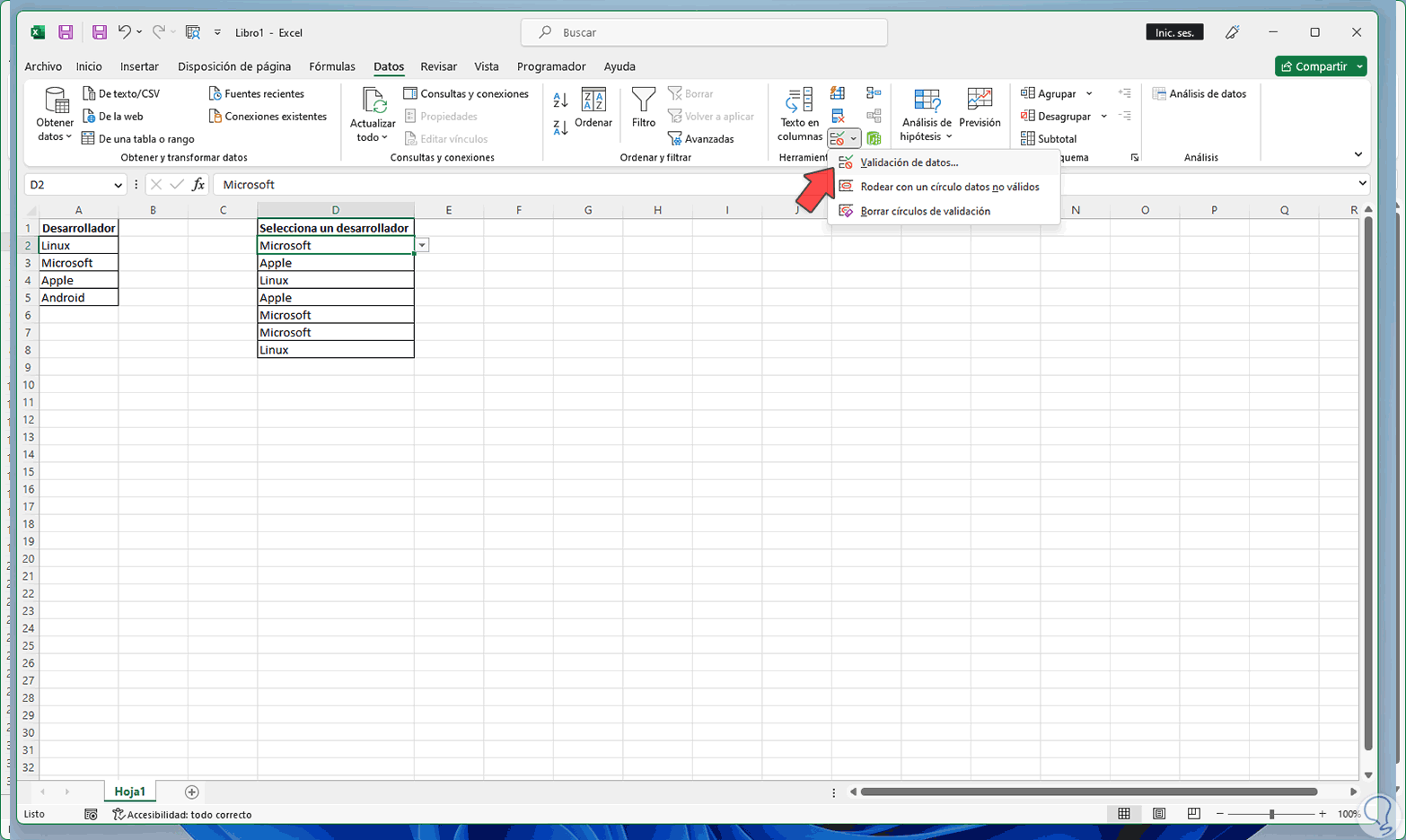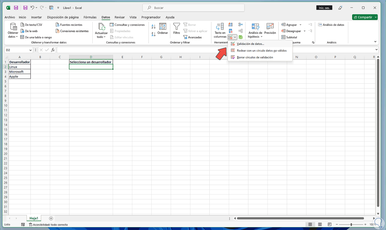 Selecciona la celda donde estará la lista desplegable, luego ve al menú "Datos" y allí da clic en "Validación de datos":