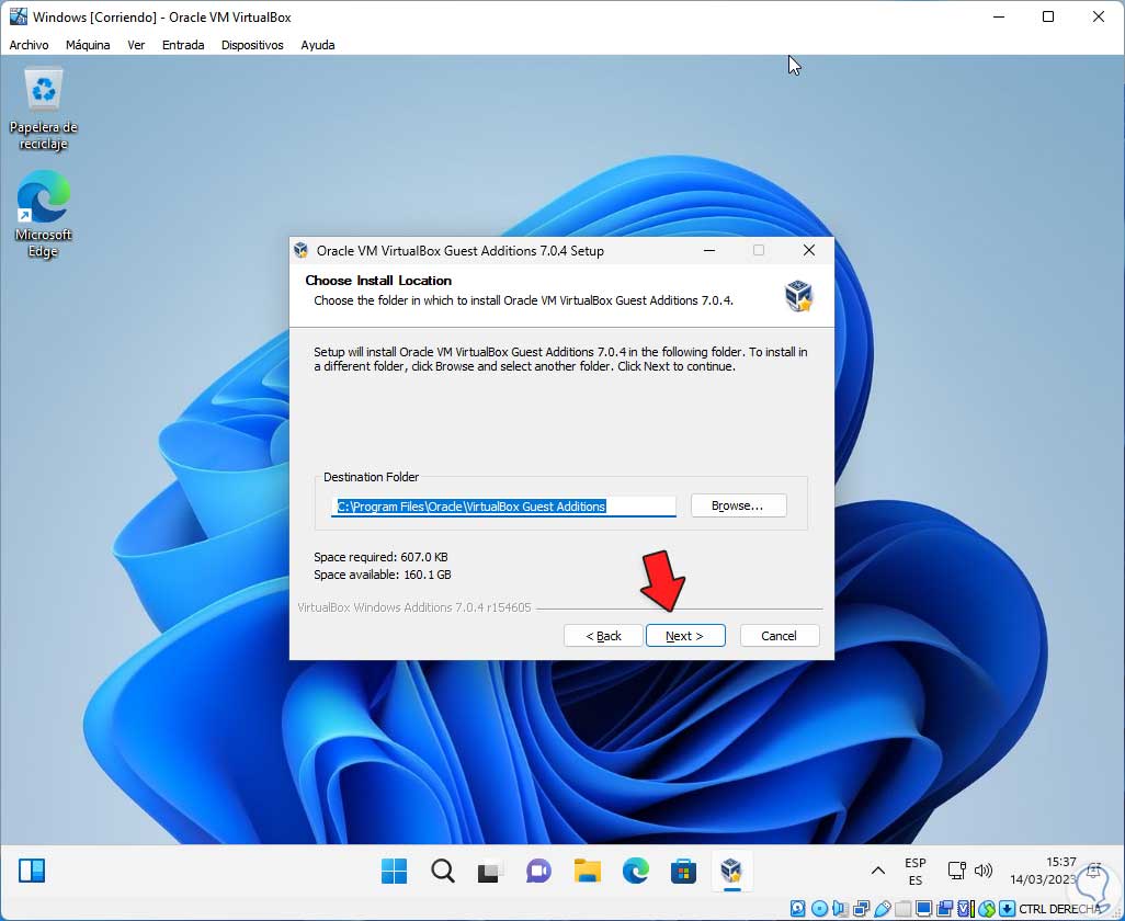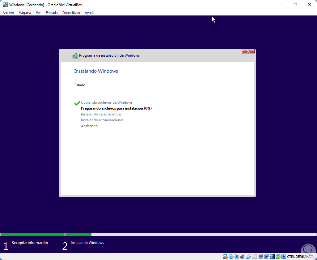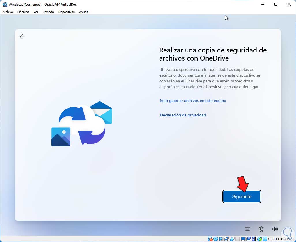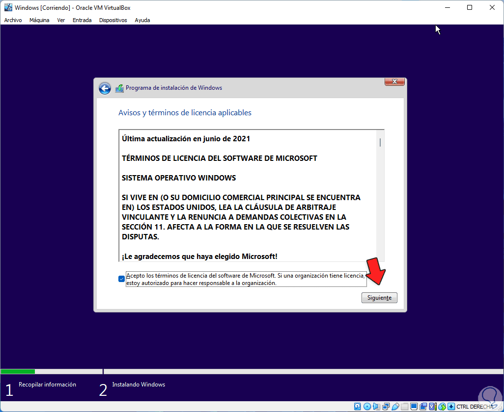 Da clic en "Siguiente" para iniciar la instalación de Windows en VirtualBox: