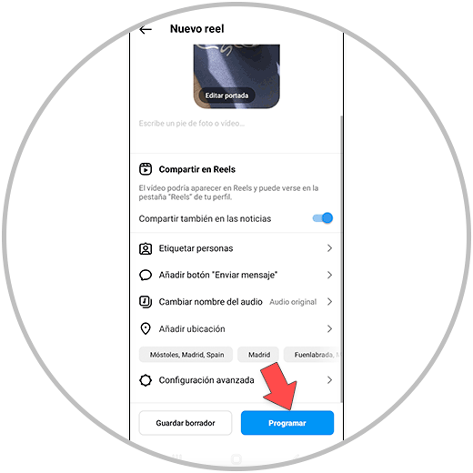 Ahora, vas a tener que activar la pestaña de “Programar este Reel”.