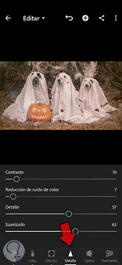 Vamos a continuar aplicando más edición a nuestra imagen trabajando tanto el enfoque como las reducciones de ruido que puedan existir en nuestra imagen de partida o bien tras la aplicación de granulado. Para ello pulsaremos sobre la opción “Detalle” y damos unos valores similares a: