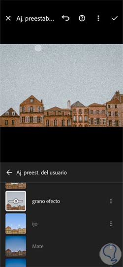 Como seguramente quieras usar el efecto granulado en otras fotografías, te recomendamos que generes un preset personalizado para usarlo cuando quieras. Para esto vamos a pulsar sobre los tres puntos superiores en la imagen: