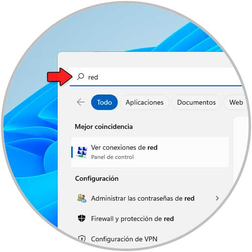 Para comprobar este método en el buscador ingresamos "red" y damos clic en "Ver conexiones de red":