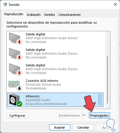 Seleccionamos los altavoces y damos clic en "Propiedades":
