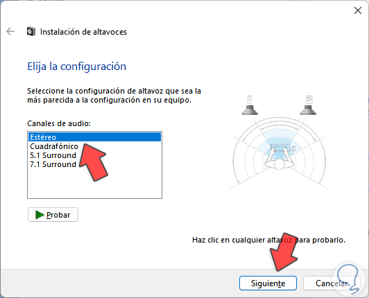 Se abrirá un asistente de configuración. Allí encontramos las diversas opciones de configurar la salida del audio pero cada una dependerá del tipo de altavoz usado por lo que todas no son funcionales, seleccionamos "Estéreo" y en la siguiente ventana confirma que la casilla "Frontal izquierdo y derecho" este activa: