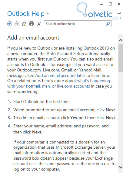 Al hacer una búsqueda se nos va a mostrar una gran cantidad de resultados y si hacemos click sobre uno vamos a tener una explicación detallada del tema, veamos como luce cuando pulsamos el enlace de ayuda Añadir una cuenta de correo electrónico: