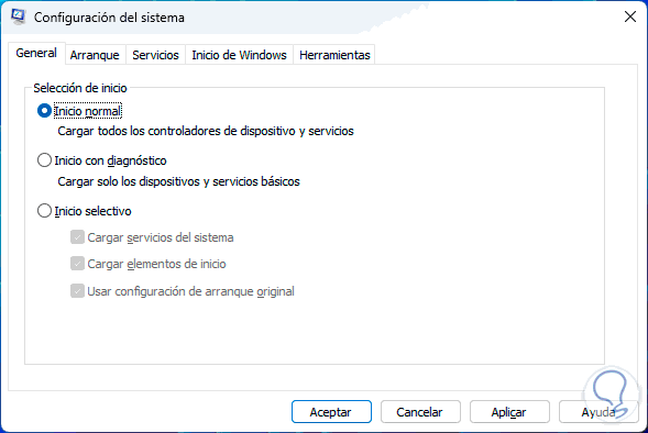 En la pestaña "General" activamos la casilla "Inicio selectivo" y desactivamos la opción "Cargar elementos de inicio":