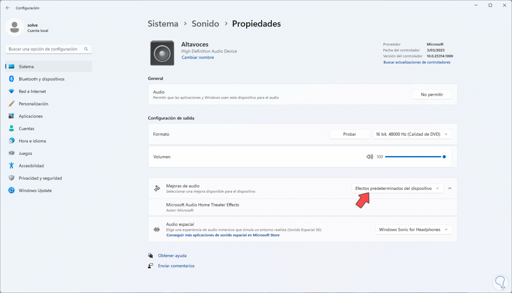 En "Mejoras de audio" validamos que esté la opción "Efectos predeterminados del dispositivo".