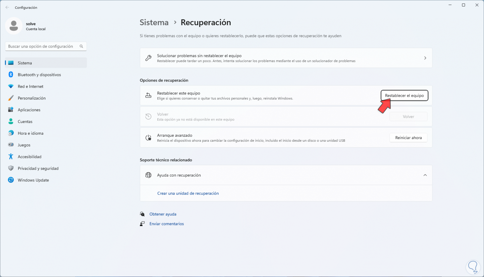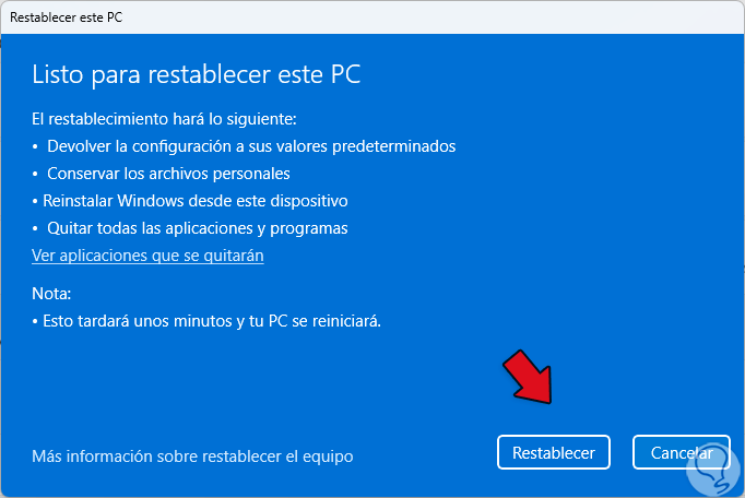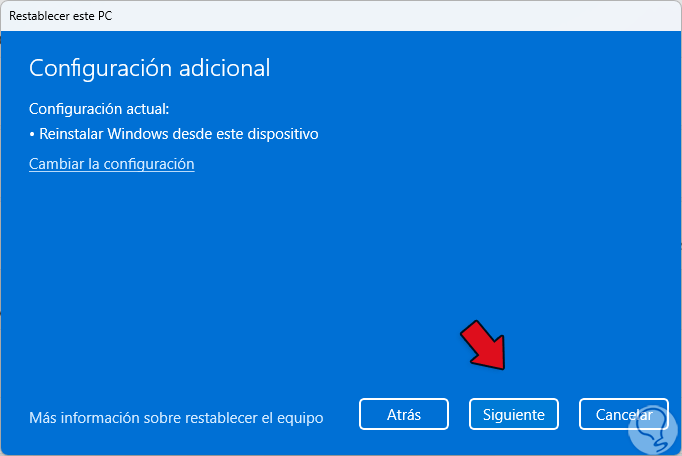 Se abrirá lo siguiente. Damos clic en "Restablecer el equipo":