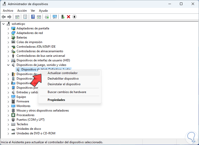 En "Dispositivos de juego, sonido y video" damos clic derecho sobre el controlador y seleccionamos "Actualizar controlador":