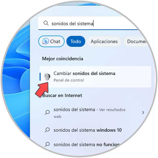 Estos son los sonidos que podemos cambiar cuando se realizar alguna acción en el sistema tal como nuevos mensajes, inicio de sesión, etc, para restablecerlos en el buscador ingresamos "sonidos del sistema" y damos clic en "Cambiar sonidos del sistema":