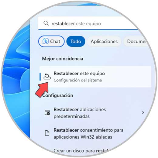 En caso de que no sea posible restablecer el audio podremos restablecer el equipo general, para ello en el buscador ingresa "restablecer" y da clic en "Restablecer este equipo":