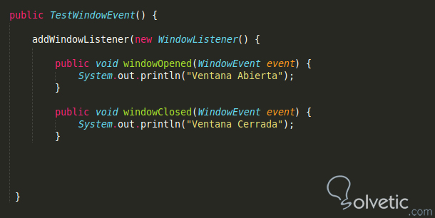 Para poder implementar los WindowEvents debemos usar el WindowListener y crear nuestro componente escucha que capturará los eventos correspondientes a la ventana del programa.