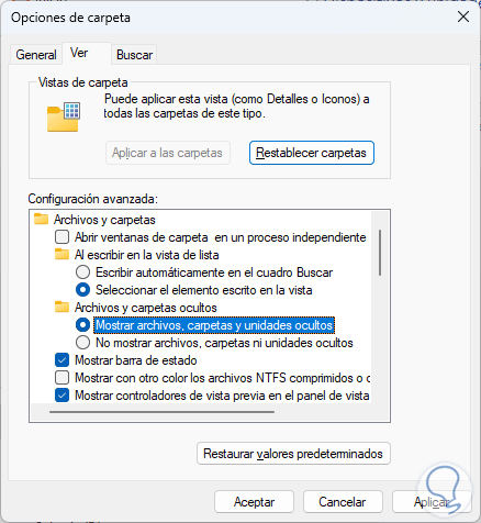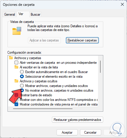 En "Ver", activamos la casilla "No mostrar archivos, carpetas ni unidades ocultos":