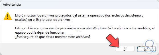Desactivamos la casilla "Ocultar archivos protegidos del sistema operativo" y saltará el siguiente mensaje: