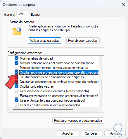 Vamos un poco mas abajo para ubicar la línea "Ocultar archivos protegidos del sistema operativo":
