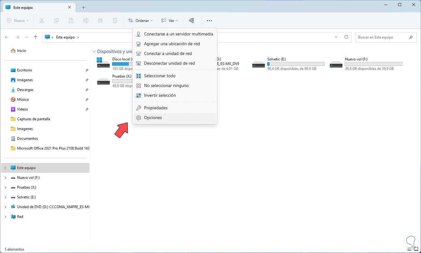 Abrimos el Explorador de archivos, damos clic sobre el menú contextual y seleccionamos "Opciones":