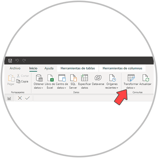 En este caso, y en lugar de pulsar en el botón de cargar datos, veremos un botón a la derecha que dice “Transformar datos” donde haremos clic.