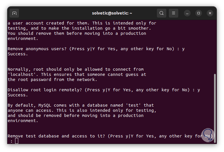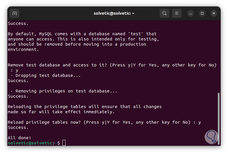 Aseguramos la instalación de MySQL ya que por defecto presenta algunas fallas de seguridad, para esto ejecutamos: