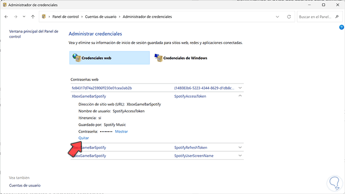 Si pulsamos sobre alguno de los credenciales veremos que se despliega su información. Si queremos eliminar alguno tendremos que pulsar sobre “Quitar”