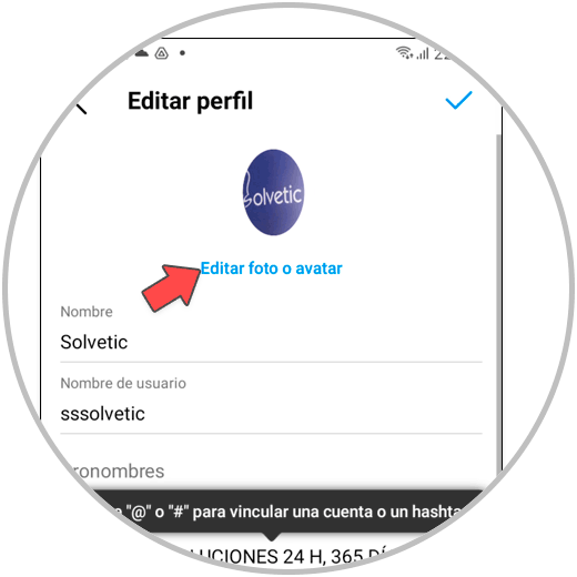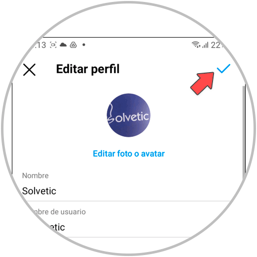 Confirma la nueva foto de perfil en el check de la esquina superior derecha.