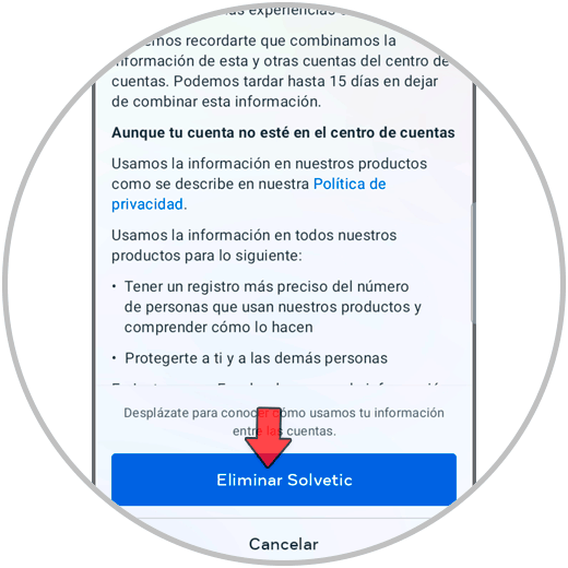 Por último, selecciona “Eliminar cuenta” y habrás terminado. De este modo habrás desvinculado la cuenta de Facebook de la de Instagram.