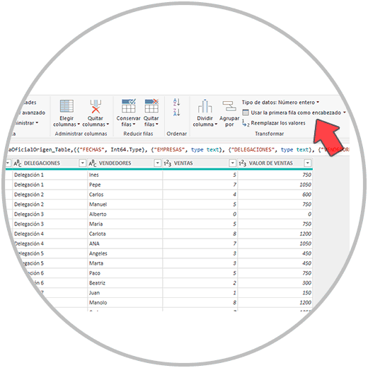 3. Revisar los encabezados: Vamos a ver si nuestros datos tienen o no los encabezados en cada columna. Es posible que, al realizar la importación, cuando abrimos el editor Power Query veamos que los nombres de las columnas no están, o están en la primera fila. Si los datos están en la primera fila, haremos clic en “usar la primera fila como encabezado”