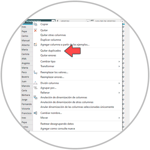 10. Eliminar duplicados: Otra de las funciones interesantes del editor de Power Query, en tareas de limpieza de datos y depuración de tablas antes de realizar informes, visualizaciones, etc. es la posibilidad de poder eliminar datos duplicados. Algo que puede ocurrir, especialmente cuando hacemos cruces de datos. En este punto, hay que tener cuidado; El hecho de que se repita un campo no implica una duplicación en sí. Por ejemplo, si tenemos varias ventas realizadas por un mismo vendedor en el mismo día, no significa que todas esas ventas estén duplicadas. Para poder eliminar duplicados, simplemente haces clic en el botón derecho en el nombre de la columna con los datos duplicados, donde encontraremos esta función "Quitar duplicados".